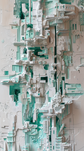 astact art, urban city, many details, white brackground, pastel green acents --ar 9:16