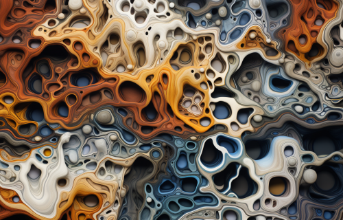 Assemblage technique, Anila Quayyum Agha sculpture, Cecily Brown painting style::1.1 Chemigram technique, vibrant colours::0.5 textures, deep purple, brown, grey, yellow, dark blue, white, super detailed, intricate, An acrylic painting of the floss of taylor effused copiously from the moulten fissure --chaos 11 --ar 14:9 --v 5.2