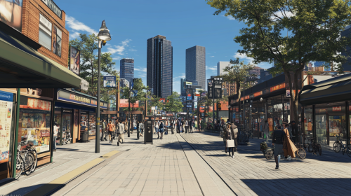 Generate a realistic, lifelike image of a bustling cityscape in front of a train station. People are moving in and out of the station, surrounded by shops, cafes, and office buildings with realistic textures. The sidewalks show bicycles and bus stops, and traffic lights are depicted in a realistic manner. The streets are clean and well-organized, with lifelike skyscrapers visible in the distance under a bright blue sky. The overall atmosphere should capture the feel of a real, vibrant urban area. --ar 16:9