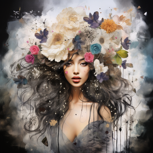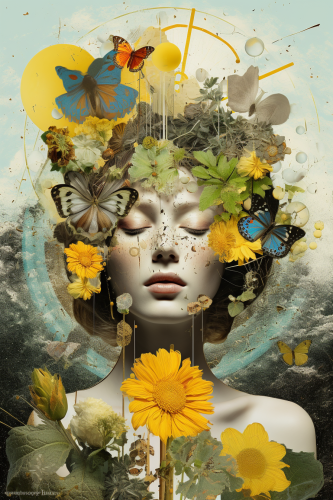 Surrealist illustration. Close-up portrait. Black American hippie woman with afro and colorful dashiki surrounded by vibrant flowers in a mystical garden. Vivid watercolor details. Swirling patterns and textures reminiscent of Kerry James Marshall's style. Soft focus and subtle gradient. Warm, golden lighting with pastel colors and gentle, feathery brushstrokes. Highly stylized, dreamlike atmosphere. Vibrant, expressive, and emotive, with bold linework and generous textures. Inspired by the works of Romare Bearden and Henri Rousseau. Dynamic, eclectic, full of movement and life. Detailed, intricate, and full of hidden symbolism. --v 6.1