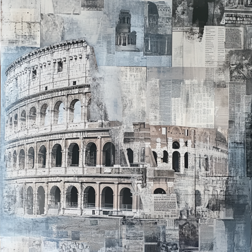 A collage of various images representing Rome, such as the Colosseum and ancient buildings, with an emphasis on gray tones. The background is filled with different textures like newspaper clippings and delicate paper cutouts. In the center, there's a large square shape made from these elements. It has a vintage feel to it. There should be some blue accents in the composition.
