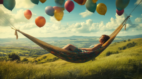 hyperrealiscitc. photorealistic. a chubby woman relaxes in her hammock. the hammock is held by colorful ballons, flying in mid air. the scene is set against a lush, green hilly landscape. adding a tranquil backdrop to the magical moment. --ar 16:9