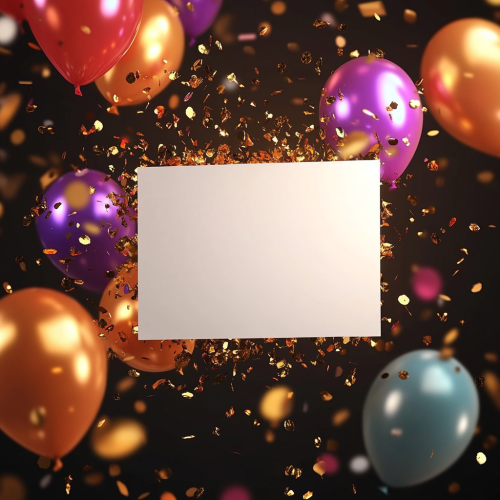 realistic image of a centered white card in blank with gold confetti and many colorful balloons surrounding it very festive and joyful cinematic lights vibrant colors