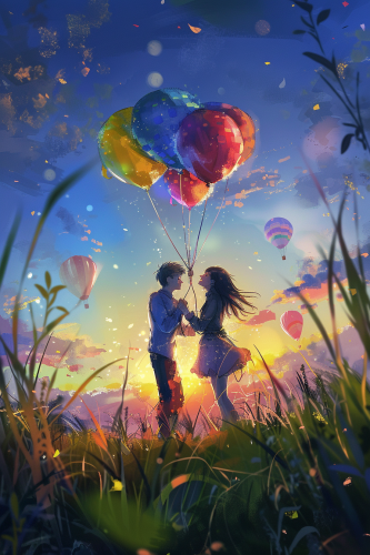 A vibrant scene focused on teaching the English language, set in an open field with colorful balloons shaped like letters of the English alphabet floating in the sky. The atmosphere is playful and inviting, with the letters representing creativity and learning. The soft lighting adds a whimsical, joyful feeling, making it an inspiring environment for language education.