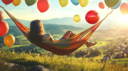 A woman relaxes in a hammock held by colorful balloons, cradling a red glass ball, reflecting light around her. The scene is set against a lush, green hilly landscape, adding a tranquil backdrop to the magical moment. --ar 16:9