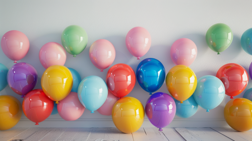 abundant colorful balloons stuck on a white wall, front view, ultra realistic picture shoot --ar 16:9