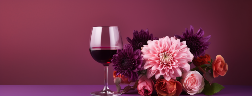 Vibrant bouquet of flowers with soft pastel pink to deep purple gradient background and a glass of red wine, uplifting and empowering atmosphere --ar 144:55 --v 5.0
