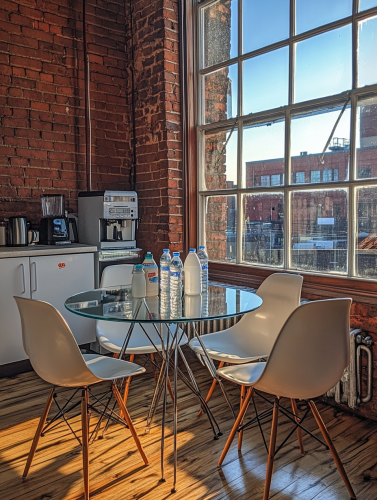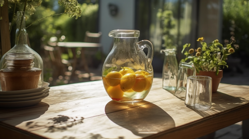 A rustic garden table in a bright, sunny garden, with a clear glass carafe filled with water as the central focus. Sunlight beautifully shines through the carafe, creating a glistening effect that enhances the refreshing atmosphere. On the table, a few scattered fruits like oranges and lemons, but minimalistic so that the attention remains on the carafe. In the background, blurry silhouettes of children playing, evoking a sense of joy and carefree summer days. The overall mood is light, fresh, and relaxing, with a soft breeze and warm sunlight. The scene invites a sense of thirst and relaxation photorealistic, natural lighting, high detail --ar 16:9 --v 5.0