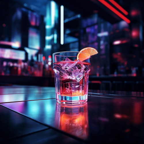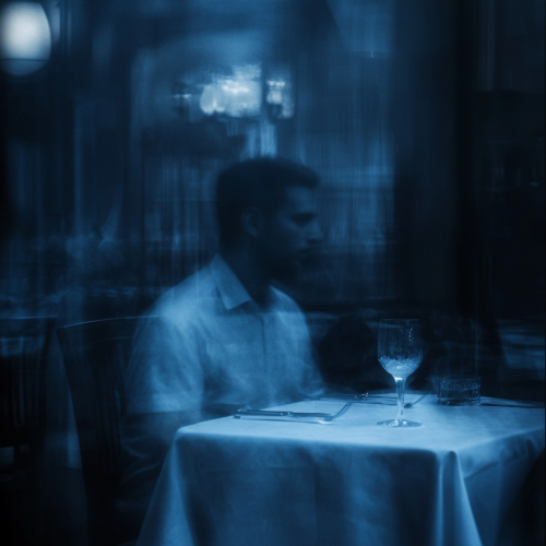 Evening tavern view, blue light filtering, a white clothed table and a glass on it, a man with an unknown face sitting at the table, blurred background, a dark and gloomy environment