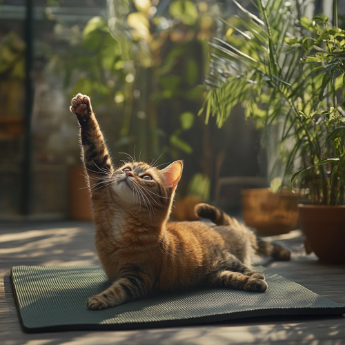 A mischievous cat doing yoga on an Alo Yoga mat in a beautiful outdoor yoga studio. The cat is stretching playfully, with a serene and stylish studio setting in the background.