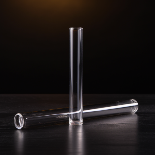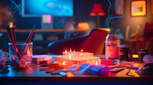 two glass hash bongs with red and blue striped accents sitting on top of a purple coast with white ADHDDEAD lettering on the front. They are sitting on a glass table. The one on the left has no red and blue accents and is completely clear quartz. This is a photorealistic product photograph shot. ar 3:4