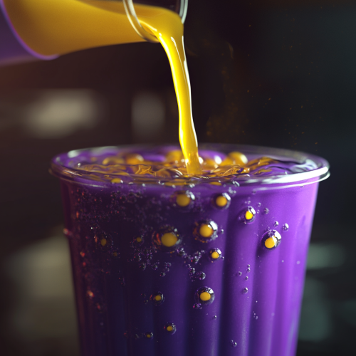 a purple bubble tea (with a steraw), in which a yellow transparent liquid is being slowly poured and dripped. Photorealistic. 4K. The scene has a quite dramatic ambiance. and low lights