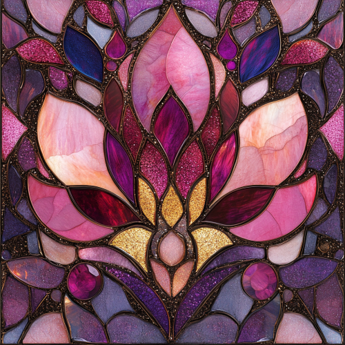 coquette design pattern in the style of stained glass, shades of pink and purple, vibrant colors and glitter and gold details--ar 9:16 --v 6.1 --stylize 250