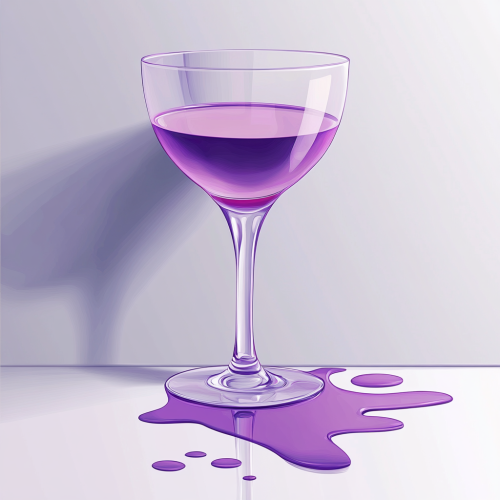 a glass with round bottom with purple juice that is overflowing and dripping onto the floor. photo realistic. extra points if the glass has a fine stem.