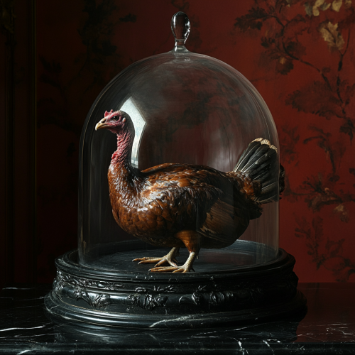 A turkey under a glass dome on top of a black marble table, in a dark room with painted walls and birds flying in the background, hyper-realistic photography in the style of [Artist name].