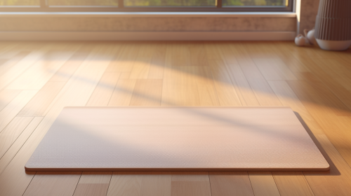flat yoga mat with round corner mockup, no props on top of the mat, light wooden floor --ar 16:9