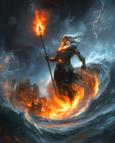 The Lord of the Void, Poseidon, commanding the whirlpool of Atlantis. The vortex spirals into a dark void, while Poseidon stands in the center with his glowing trident. The ruins of Atlantis shimmer beneath the waves, illuminated by the swirling energy. The background is a dark, stormy ocean with flashes of lightning, adding to the powerful, mystical scene. Created Using: intricate water textures, vivid lighting effects, dynamic composition, ethereal glow, high-detail character design, surreal realism, powerful atmosphere --v 6.1 --ar 4:5 --no border, sign --s 345 --c 45