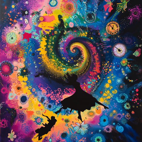 A swirling vortex of vibrant, kaleidoscopic patterns and fractals, reminiscent of 1960s psychedelic art. Within the colorful chaos, dark silhouettes of figures are seen falling or dissolving into nothingness. Surreal landscapes morph into abstract shapes, while clock faces melt and distort, symbolizing the meaninglessness of time. Bright neon mandalas contrast with void-like black holes. Floating amidst the psychedelic colors are stark, monochrome symbols of emptiness and futility - broken hourglasses, wilting flowers, and shattered mirrors. The overall composition should evoke a sense of both visual ecstasy and existential despair.