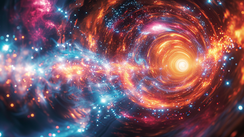 Vibrant anime-style illustration of a swirling vortex of information converging towards the center of the image. Colorful data streams, symbols, and icons spiral inwards with dynamic motion. In the background, faint outlines of books, scrolls, and abstract representations of knowledge float ethereally. The overall aesthetic is pop art meets anime, with bold colors and clean lines. The central vortex radiates energy and movement, drawing the viewer's eye to the heart of the knowledge spiral. --ar 16:9 --v 6.0 --style raw --s 750