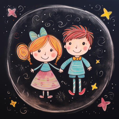 childrens book illustration , pencil , water color , hand drawn , sketchy , A swirling vortex in the cosmos, filled with tendrils of shadow pulling stars into darkness. Luna and Sol hover above it on their cosmic creatures--Luna rides a silver-winged dragon made of stardust, and Sol rides a golden phoenix with fiery feathers. Around them are glowing galaxies and distant, colorful planets. The vortex radiates an ominous, dark energy, contrasting with the brilliant stars.