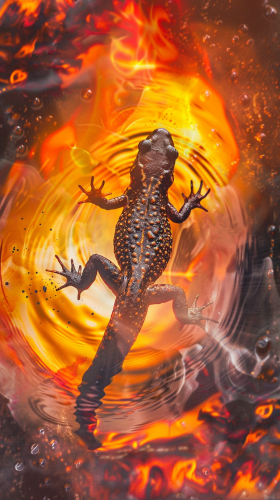 cinematic, portrait photography, A Salamander dancing within a fiery vortex, its small lizard-like body glowing with intense heat, embodying its mastery over flames --ar 9:16 --s 0 --v 6.0 --style raw
