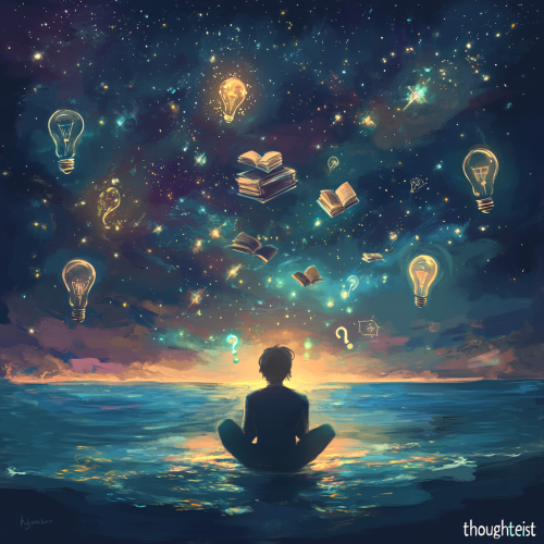 A serene night sky with twinkling stars over a calm ocean, where the water reflects the cosmic vastness above. In the center, an abstract silhouette of a person deep in thought, surrounded by floating glowing symbols of knowledge like books, lightbulbs, and question marks. The colors are a mix of deep blues, purples, and soft golds, creating a dreamy and introspective atmosphere. The text "thoughtheist" is subtly integrated into the design, blending with the starry sky, with a modern and minimalist font. --v 6.1