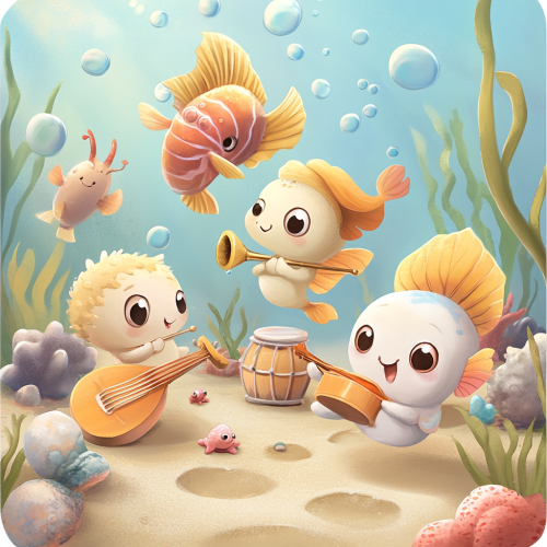 The central image shows a group of adorable baby fish marching in a playful underwater parade. Each fish is playing a different, whimsical musical instrument. For example: A tiny baby angelfish is blowing into a conch shell as if it were a trumpet. A baby seahorse is playing a seaweed violin with a sea urchin bow. A cheerful baby clownfish is banging on a drum made from a coconut shell. A tiny, pudgy baby octopus is multitasking with multiple arms, playing a set of starfish cymbals. The parade is taking place on a sandy seabed with swaying seaweed, small corals, and bubbles floating around, with a few sea creatures like a dancing crab or jellyfish joining the fun.-Fishdom mobile game style
