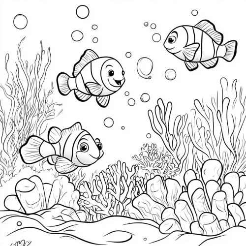 The central illustration depicts a vibrant coral reef scene. A colorful clownfish is swimming near an anemone, surrounded by a diverse array of coral and other small reef fish like butterflyfish, damselfish, and a sea turtle in the background. The reef is filled with intricate details, such as branching corals, seaweed, starfish, and small, hidden marine creatures (like shrimp or seahorses) to make the page more engaging and challenging to color. - Fishdom mobile game style