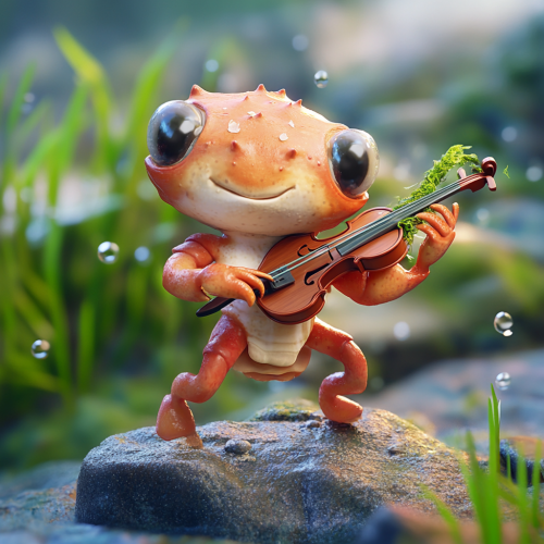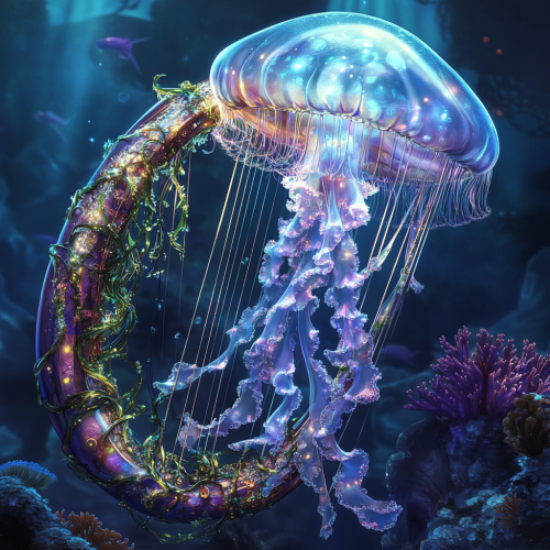A graceful jellyfish with flowing tentacles is playing a harp made of intertwined seaweed strands stretched across two pieces of coral. The jellyfish’s tentacles gently pluck the strands, creating a peaceful, melodic vibe.- Fishdom mobile game style
