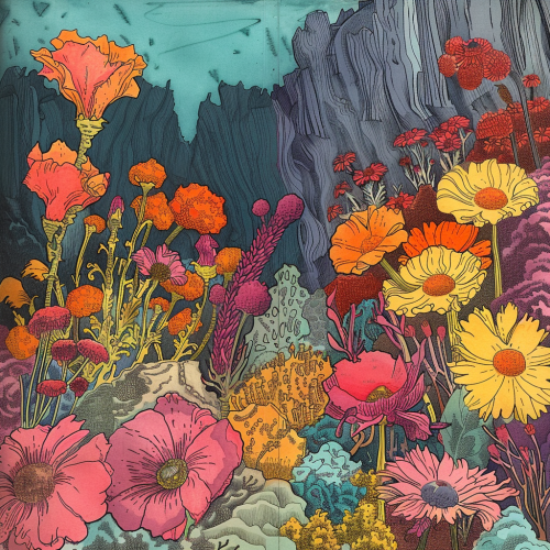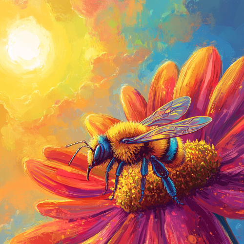 bright colorful realistic detailed drawing with paints, close-up of a bee sitting on a large colorful flower against the background of the sun and sky