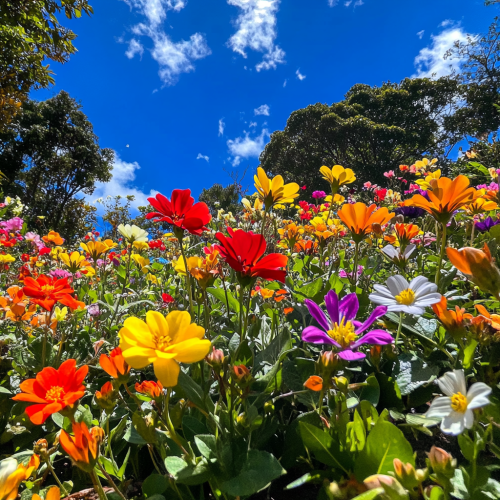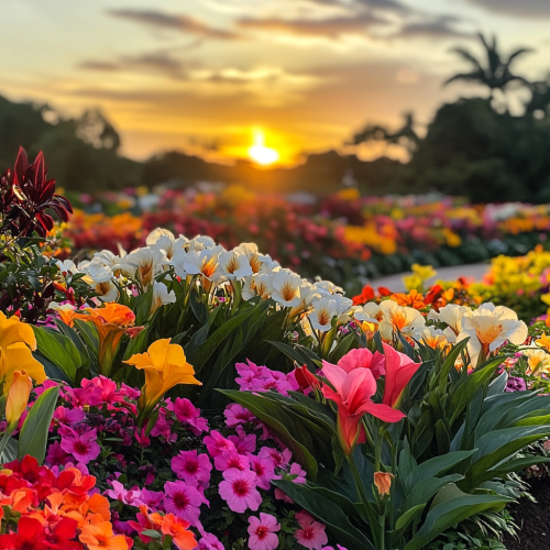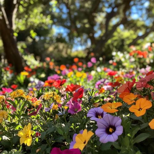 A garden filled with a variety of colorful flowers, each color complementing the other, under the warm and bright afternoon light. Taken with an iphone 15 pro