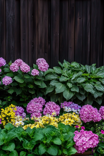 Create an image of a well-maintained, raised flower bed against a dark wooden fence backdrop. The flower bed is made of thick, rustic wooden planks and is filled with a variety of plants and flowers. The garden includes pink hydrangeas, purple phlox, yellow and white flowers, green ferns, and a variety of leafy plants with different textures and shades of green. Some plants have variegated leaves, adding visual interest. The fence behind the flower bed consists of dark brown, horizontal wooden panels with vertical support posts. The overall scene is rich with greenery and colorful blooms, providing a lush and structured garden look. --ar 2:3