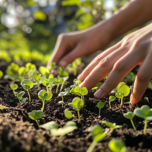 Close-up of hands gently tending to young plants in a garden, soft sunlight highlighting the tender care, focusing on the delicate beauty of growth and nurturing. Taken with an iphone 15 pro