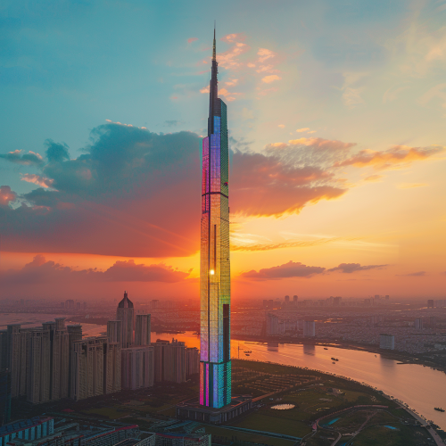 Landmark 81 tower in Vietnam is built with colorful towels, behind the tower is the bright sun. realistic HDR 8k