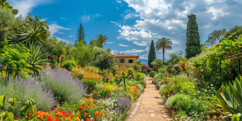 lively photorealistic ; professional,natural (sun) lighting, a captivating scene of a lush garden surrounding a sumptuous villa on the Côte d'Azur in France. The garden should be filled with colorful flowers, exotic plants and winding paths. The sky above should be a brilliant, cloudless blue, bathed in warm sunlight. Be sure to capture the relaxing, luxurious atmosphere of this location, with details that highlight the region's Mediterranean charm. Bring out vivid colors, rich textures and create an ambience that evokes the serenity and opulence of this sunny garden on the French Riviera, hyper-realistic, 8k quality, professional,natural (sun) lighting,magazine photography v 6.0 --ar 2:1