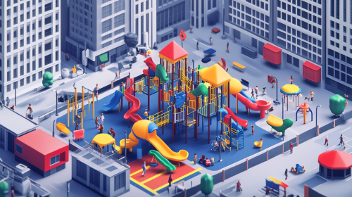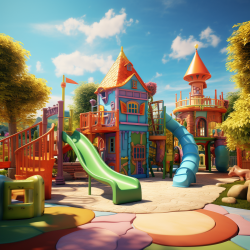 A playground indoors on a television film set surrounded by a picket fence on astro turf with a sandbox, a jungle gym, a swingset, and a tube slide. Kids colors. blue sky. vibrant.