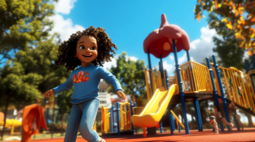 "A playful game of Hide-and-Seek in a vibrant, whimsical playground. Sally, a spirited child with a mischievous smile, runs off into the distance but always circles back near a large. The scene is full of lively colors and dynamic movement, capturing the excitement and strategy of the game. ultra realistic --ar 16:9