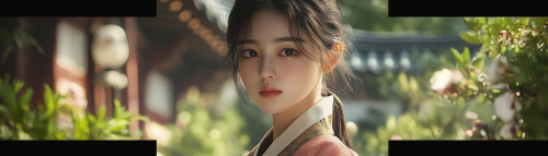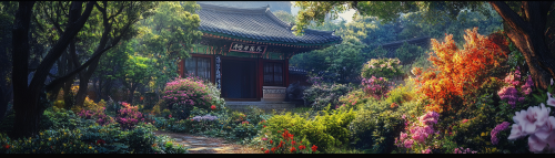 Photorealistic photograph of a vibrant garden with lush greenery and colorful flowers. In the background, a historic Korean building with traditional architectural details is prominently visible. The garden is bathed in soft, natural light that highlights the intricate textures of the plants and flowers. The contrast between the vibrant, lively garden and the serene, historical building creates a visually striking and harmonious composition --ar 7:2