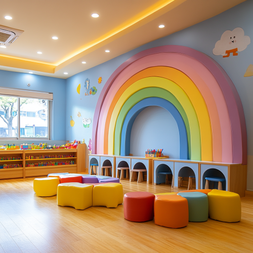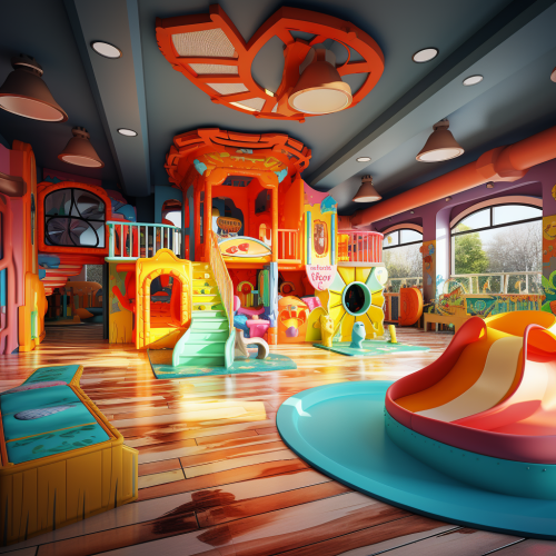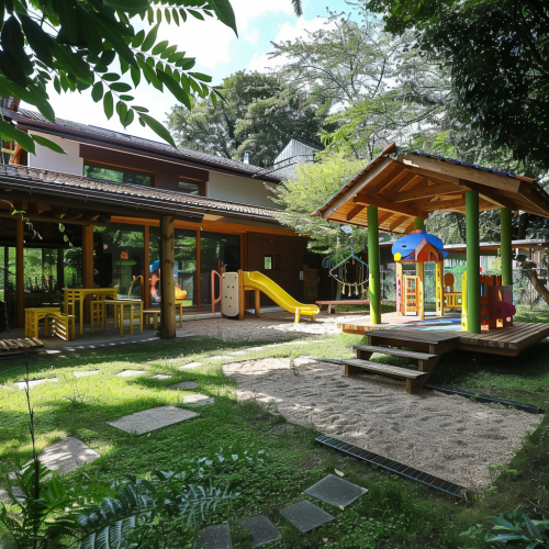 kindergarden, 1 floor building, in garden with playground, small building, big garden, minimalist