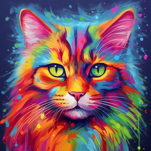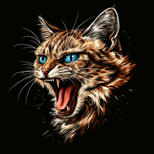 T-shirt design featuring a colorful portrait of an aggressive cat with blue eyes and an open mouth, against a black background. Detailed drawing, high-resolution vector illustration