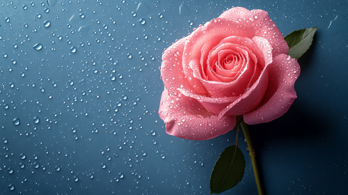 Create a minimalist phone wallpaper featuring a solitary [rose] with its stem centered in the frame against a [blue] plastic surface covered with small water droplets. The droplets add an interesting texture and a visual effect of freshness and humidity. The composition is simple yet effective, focusing on the natural beauty of the flower and the texture of the background. Use a close-up perspective similar to a macro photograph. --ar 16:9 --s 800