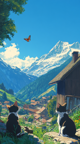 Makoto Shinkai's animation style. Vivid colors. Detailed depiction. Gentle atmosphere. The village of Grimentz at an altitude of 1572 meters. The clear blue sky. Two kittens. A cat playing with a butterfly. --ar 9:16 --v 6.1