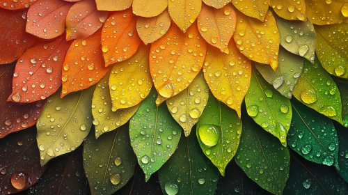 leaves with water droplets on them, arranged in a gradient of colors from green at the bottom to yellow, orange, and then red towards the top. The leaves are positioned in such a way that they create an arc across the image, reminiscent of a rainbow. The vibrant colors and the pattern formed by the water droplets make this image visually interesting and aesthetically pleasing. --ar 16:9