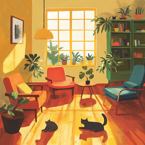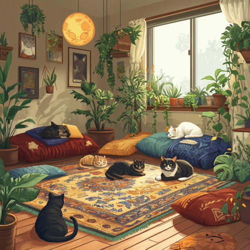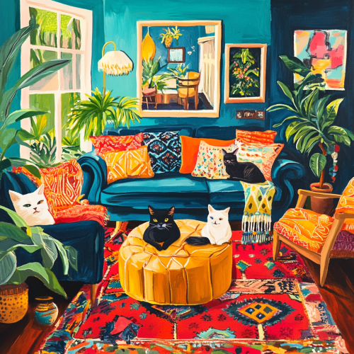 Create an illustration where colorful rugs, pillows, and plants fill a cozy living room, while cats play and rest in various nooks. The design should evoke warmth and happiness, with soft lighting and rich textures complementing the playful feline presence.