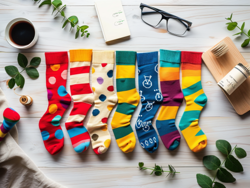 Flat Lay of Colorful Socks with Different Patterns on a Wooden Surface: The photo features a flat lay of various pairs of colorful socks with different patterns--stripes, polka dots, geometric shapes, and playful motifs like small bicycles or cats--neatly arranged on a light wooden surface. The colors are vibrant, including red, yellow, blue, green, and purple. Next to the socks, there is a small notebook with handwritten style tips and a pair of black glasses, suggesting a touch of personality and creativity. A few green leaves and a cup of coffee add a cozy, casual feel, evoking a sense of European street style mixed with personal flair --ar 4:3 --s 50 --v 6.0