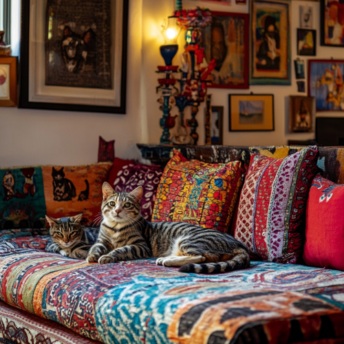 Illustrate a lively, warm living room with a mix of rich, bold colors and playful patterns. Cats roam freely, their personalities blending into the dynamic and joyful ambiance of a vibrant, homey space.