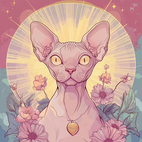 Crie uma ilustração para uma carta de tarot com o tema do amor, destacando um gato Sphynx como o elemento principal. A imagem deve ser em cores pastel sólidas, criando uma sensação suave e etérea. O gato Sphynx deve ser retratado de forma carinhosa e encantadora, com detalhes que simbolizem o amor, como corações sutis ou elementos florais ao redor. O fundo deve ser em tons pastéis que complementem o tema do amor, como rosa, lilás e azul claro, e incluir sÃmbolos associados ao romance, como duas mãos se unindo ou uma aura de luz suave.