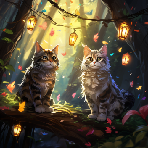 Illustrate a wild scene where cats are dancing in a vibrant, pastel-colored jungle. Trees and plants are in soft, candy-like shades, and the cats wear funky outfits, grooving under neon lights with abstract geometric shapes floating in the background.