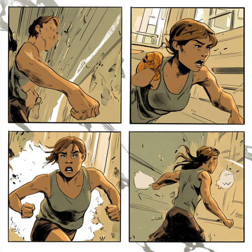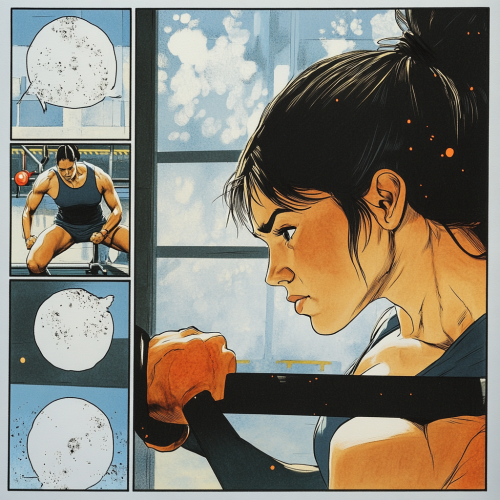 Craft a riveting multi-panel comic page depicting a female olympic weight lifter at the tokyo olympics, with each panel capturing a different moment of intensity and excitement, utilizing dynamic composition and pacing to bring the scene to life. Ensure the incorporation of thought bubbles, speech balloons, or sound effects to convey dialogue, inner thoughts, and the atmosphere of the scenario, thus embracing the quintessential elements of comic book storytelling. Make sure each speech bubble fits inside the associated panel. Add a small border around the edge of the image and each panel