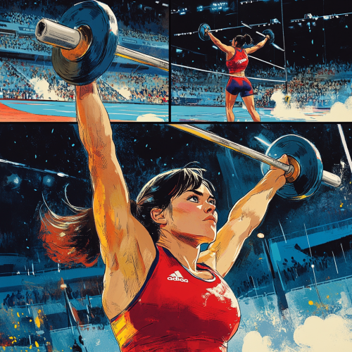 Craft a riveting multi-panel comic page depicting a female weight lifter at the olympics, with each panel capturing a different moment of intensity and excitement, utilizing dynamic composition and pacing to bring the scene to life. Ensure the incorporation of thought bubbles, speech balloons, or sound effects to convey dialogue, inner thoughts, and the atmosphere of the scenario, thus embracing the quintessential elements of comic book storytelling. Make sure each speech bubble fits inside the associated panel. Add a small border around the edge of the image and each panel --v 6.1